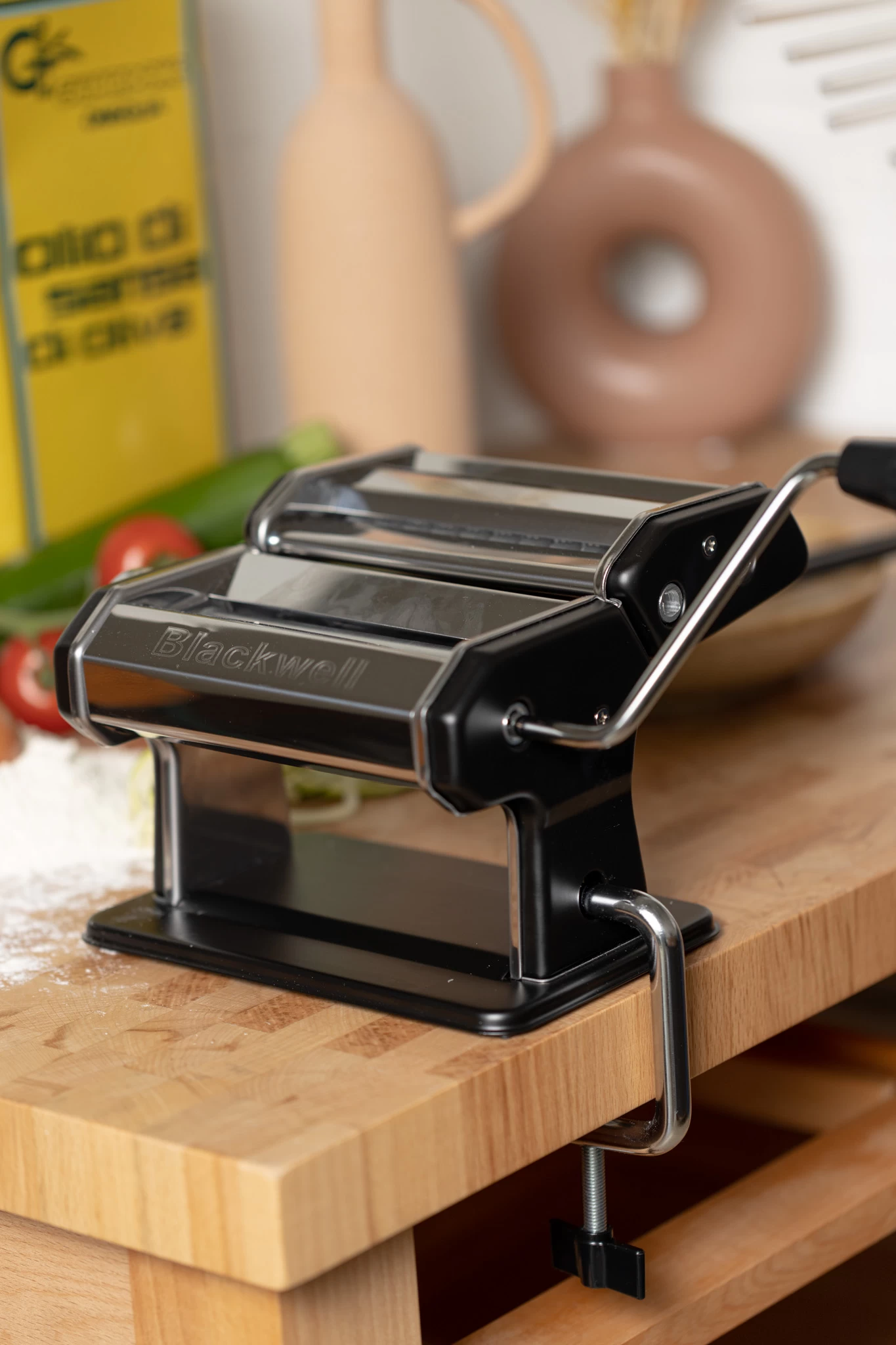 Met de Blackwell Pastamachine maak je snel en eenvoudig pasta. Kneed deeg van eieren en bloem en maak je eigen spaghetti of tagliatelle. De pastamachine beschikt over een montageklem, waardoor je hem stevig op zijn plaats kunt houden tijdens het draaien. Met de draaiknop aan de zijkant stel je de gewenste deegdikte in.