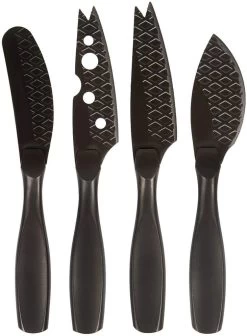 De Kaasmessenset Mini Monaco+ Zwart is uniek, stijlvol en geschikt voor elk type kaas. Serveer je een kaasplankje, dan hoort deze complete messenset daar absoluut bij! Extra handig: door de zwarte coating en het wafelpatroon zijn deze scherpe, roestvrijstalen messen non-stick.