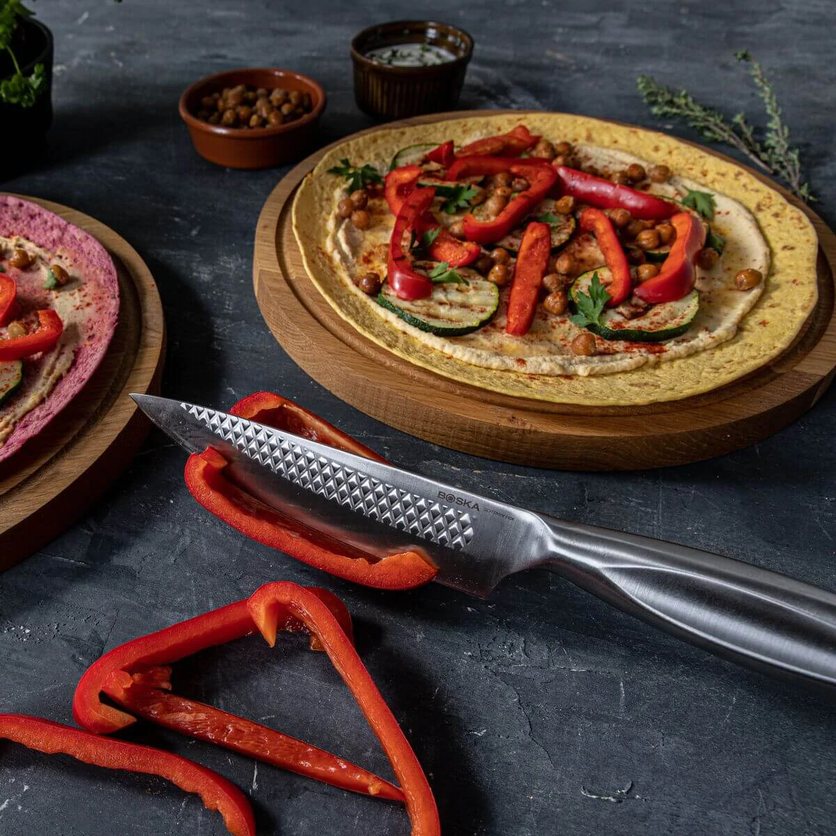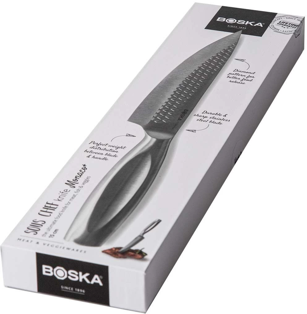 Het Boska Koksmes Monaco+ 15 cm is een compact koksmes waar je alles mee kan snijden wat je maar wil. Het snijden van vlees, vis en groente gaat perfect met dit mes. Het mes is gemaakt van een hoge kwaliteit roestvrij staal met een optimale hardheid. Hierdoor blijft het mes lang scherp, kan het hard voedsel aan en is het gemakkelijk te onderhouden en te slijpen. Daarnaast zorgt het kenmerkende diamantpatroon op het mes voor minder weerstand tijdens het snijden.