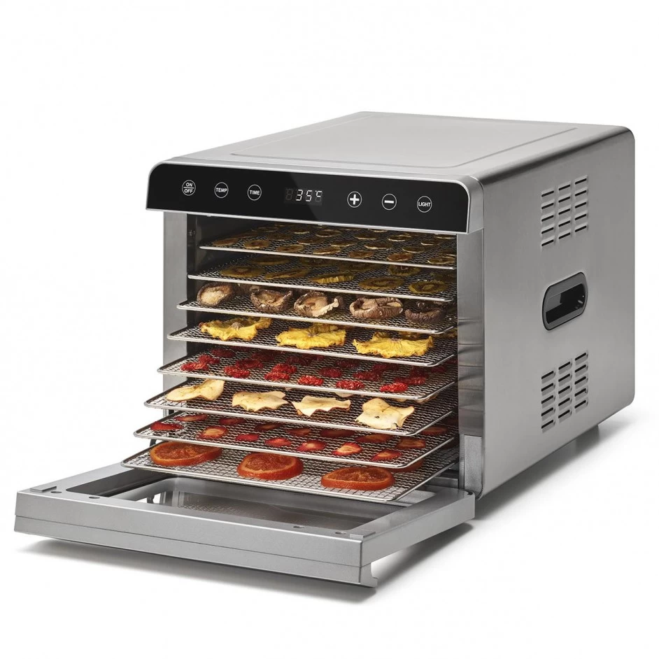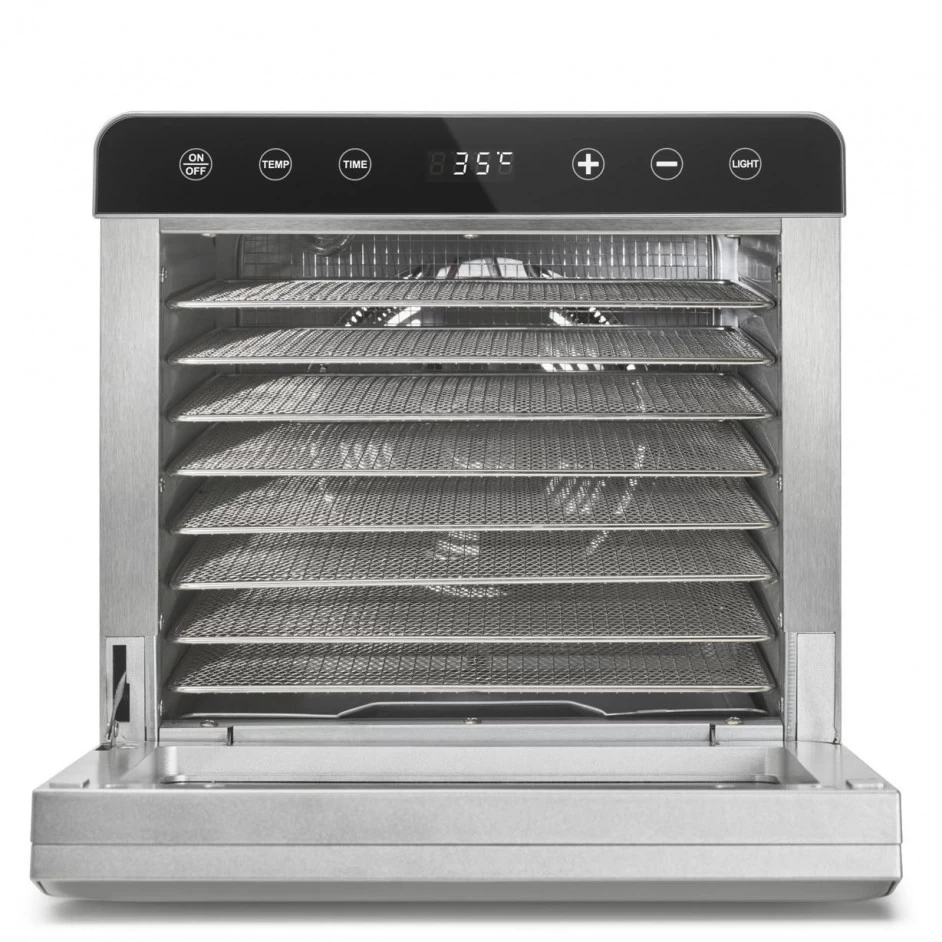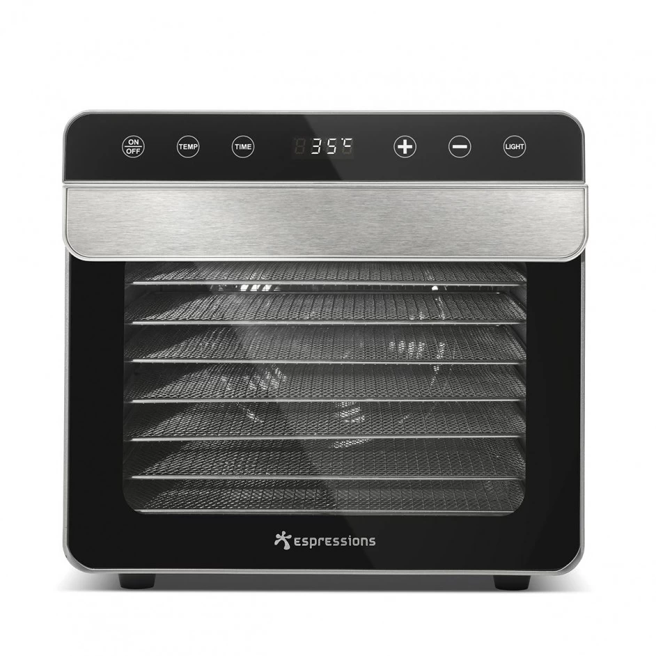 De Espressions Voedseldroger Smart komt met 8 ruime roestvrijstalen droogrekken. Het heeft een vermogen van 700 watt en is snel op de juiste temperatuur. Je kan het apparaat instellen tussen 35Β° en 85Β°Celsius en dan in stapjes 5 graden. De timer is in te stellen per 30 minuten met een looptijd van 30 minuten tot 24 uur.