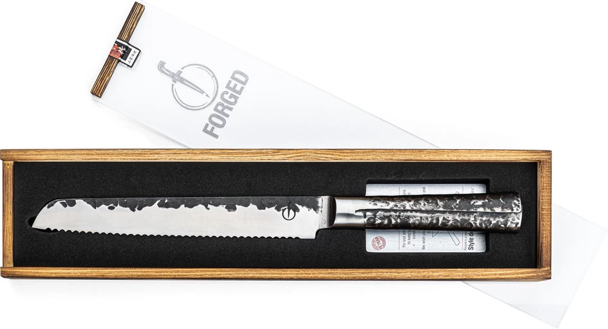 Het Forged Intense broodmes heeft een lange en gekartelde lemmet, ideaal voor het snijden van hard brood of bijvoorbeeld quiche. Daarnaast ook perfect geschikt om grotere groenten of vruchten te snijden zoals meloen, pompoen of ananas. De Forged Intense messen zijn vervaardigd van Japans 440C Staal met een hardheid van 58 Rockwell. Alle Forged messen zijn met de hand gesmeed, hebben een lemmet dikte van 2 mm en een snijhoek van 18 graden. Verpakt in een luxe houten kistje.