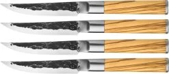 Een goed stuk vlees hoort gesneden te worden met een goed mes. De Forged Olive steakmessen hebben een glad lemmet waarmee je kunt snijden door een prachtig stukje vlees zonder een vezel los te trekken. De Forged Olive messen zijn vervaardigd van Japans 440C Staal met een hardheid van 58 Rockwell. Alle Forged messen zijn met de hand gesmeed, hebben een lemmet dikte van 2 mm en een snijhoek van 18 graden. De Olive steakmessen zijn per 4 verpakt in een luxe houten kistje.