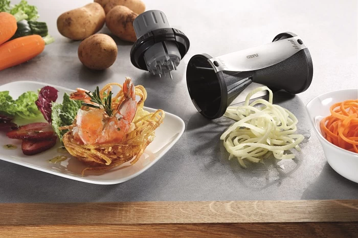 Een leuk en lekker gerecht om met de spiraalsnijder te bereiden is bijvoorbeeld courgetti met gerookte zalm, avocado en rucola. Gebruik de spiraalsnijder om van de courgette spaghetti slierten te maken, en snijd de avocado en snipper de zalm. Snijd een uitje en wat knoflook en fruit deze in de pan, roerbak vervolgens 3 minuten de courgetti mee. Voeg op het bord de avocado toe.
