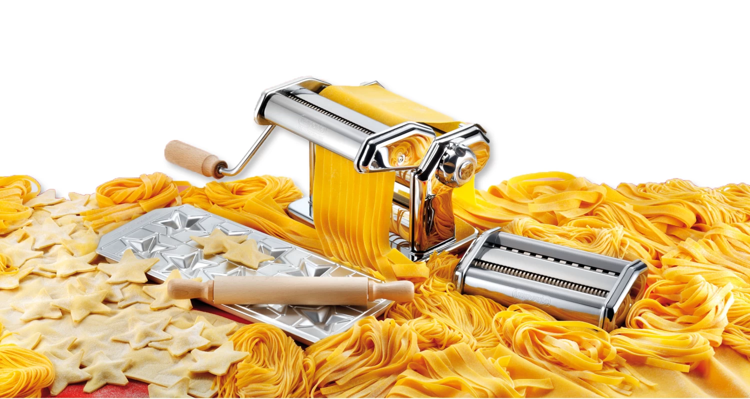 Zelf pasta maken is nog nooit zo eenvoudig geweest met de Imperia Pastamachine Set. De machine maakt het mogelijk om diverse soorten pasta te maken. De set bestaat uit een pastamachine met klem en afneembaar handvat. Dit maakt het mogelijk om de machine vast te klemmen aan het werkblad. Bij de pastamachine krijg je eveneens twee verschillende snijders. Zo is het mogelijk om zelf spaghetti, fettucini, tagliatelle en lasagne te maken. Ook is een raviolimaker met deegroller inbegrepen.