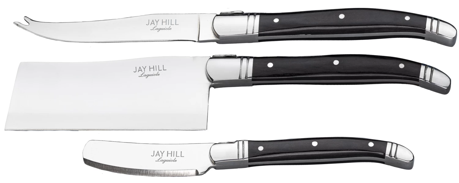 Een heerlijk kaasplankje met een glas rode wijn: krijg je er al zin in? Met deze Jay Hill kaasmessenset Laguiole zwart heb je een luxe set van drie verschillende kaasmessen. De twee kaasmessen en het hakbijltje zijn geschikt voor zowel harde- als zachte kazen. Deze stijlvolle messen beschikken over een elegant zwart handvat gemaakt van ebbenhout.