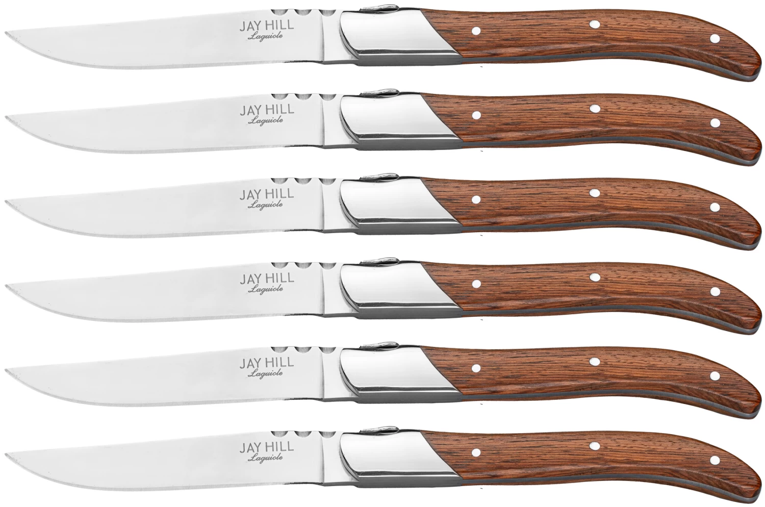 Jouw mals gebraden vlees perfect in plakjes snijden? Met deze Jay Hill steakmessen Laguiole rozenhout heb je een luxe set van 6 kwaliteits-steakmessen. Deze stijlvolle messen beschikken over een elegant handvat gemaakt van rozenhout. Het lemmet is 11.3 cm lang en 2.5 mm dik. Door het gladde snijvlak snij je eenvoudig door jouw perfect gegaarde vlees. Wil je steakmessen cadeau geven aan familie of vrienden? Deze Jay Hill steakmessen Laguiole rozenhout worden geleverd in een luxe houten kist met mooie geschenkverpakking.