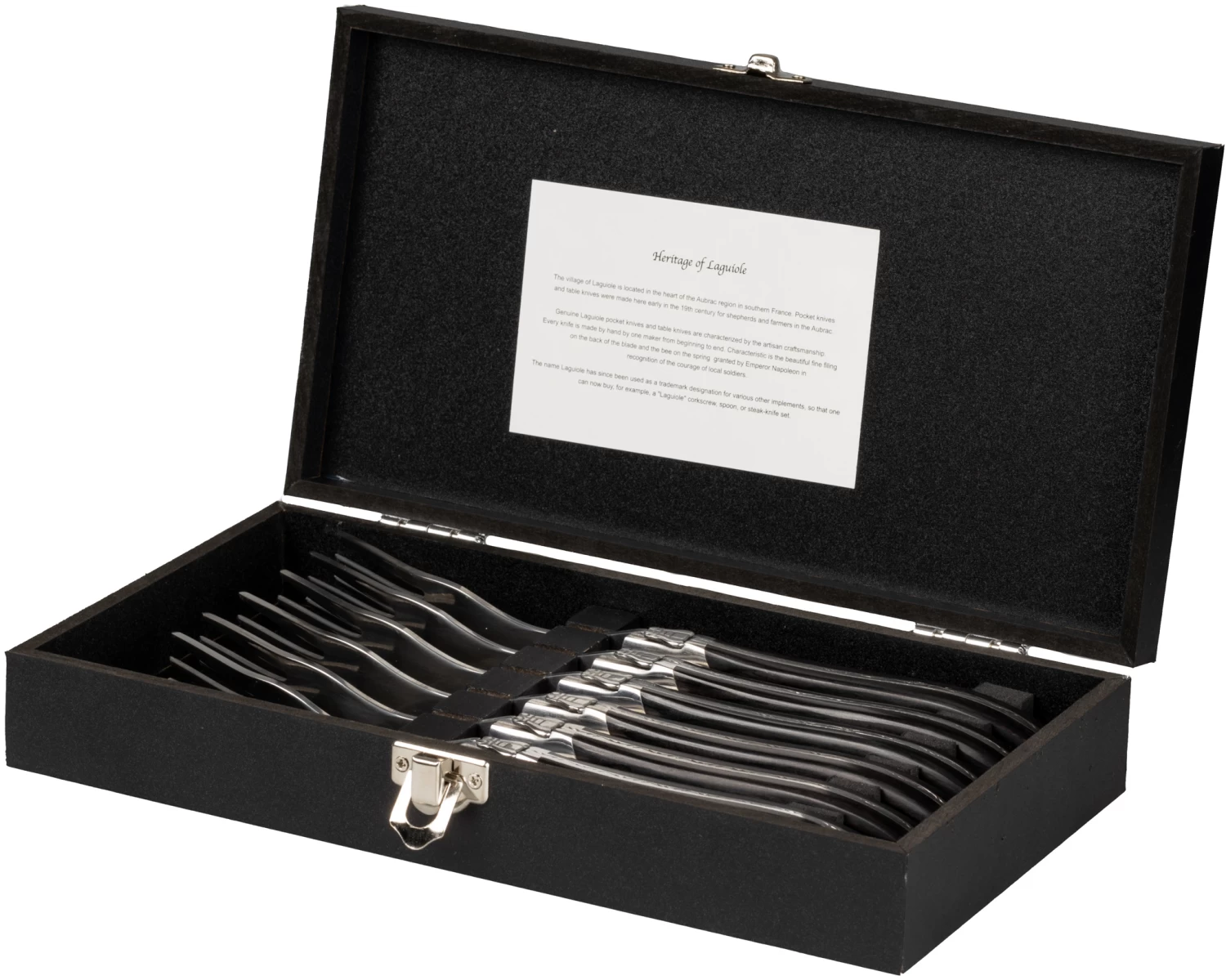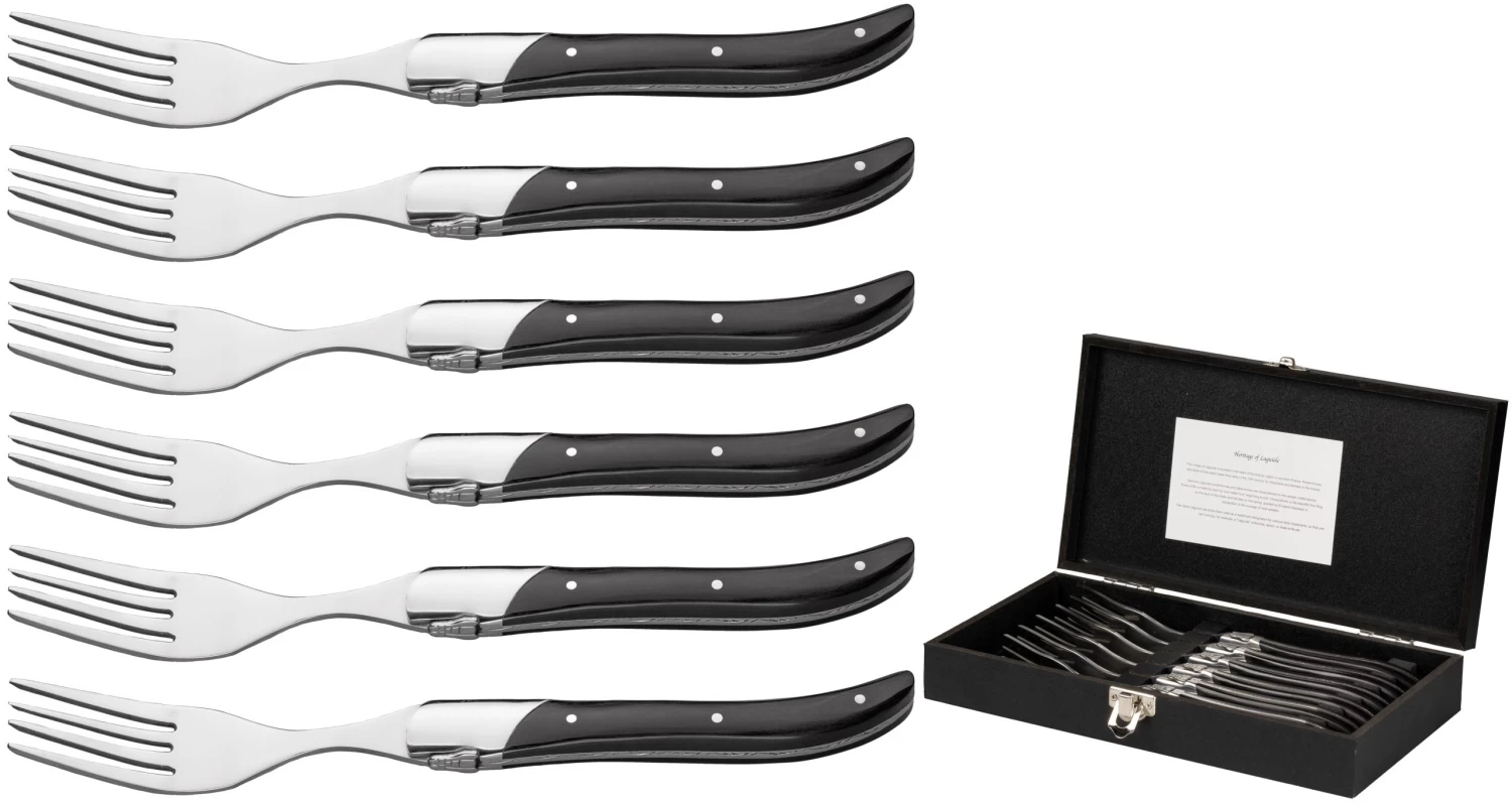 Bij een lekker stukje vlees van de barbecue mogen natuurlijk stijlvolle steakvorken niet ontbreken! Met deze Jay Hill Steakvorken Laguiole Zwart 6 Stuks geniet jij nog meer van je stuk vlees. De vorken hebben een stijlvol handvat gemaakt van ebbenhout. Daarnaast zijn ze leuk verpakt in een houtendoosje. Ook leuk om als cadeau te geven dus! Na het gebruiken van de Jay Hill Steakvorken Laguiole Zwart 6 Stuks zijn deze eenvoudig schoon te maken met de handwas.
