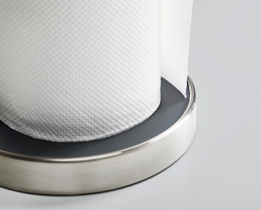 Deze handige keukenrolhouder heeft een dop die door middel van een veer naar beneden kan worden geschoven om de rol vast te zetten, zodat de keukenrol gemakkelijk kan worden afgescheurd. De antisliplaag houdt de keukenrol tijdens gebruik stevig op zijn plaats. Deze keukenrolhouder is ook erg hygiënisch en kan met de pols of onderarm worden bediend als je handen vies zijn. Om de rol te vervangen, draait u gewoon de bovenste dop eraf. De keukenrolhouder is geschikt voor keukenrollen met een hoogte tot 24 cm.