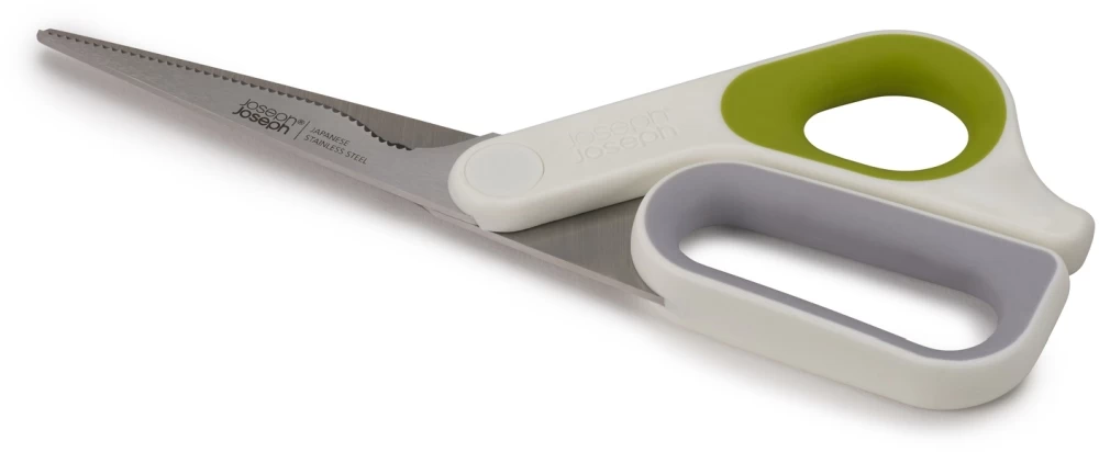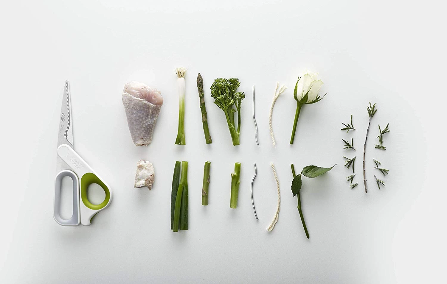 De schaar heeft Japanse roestvrijstalen messen met een gekartelde rand voor snijden, een handige mes inkeping voor dingen zoals bloemstelen en een de keukenschaar heeft een geïntegreerde kruidenstripper.
