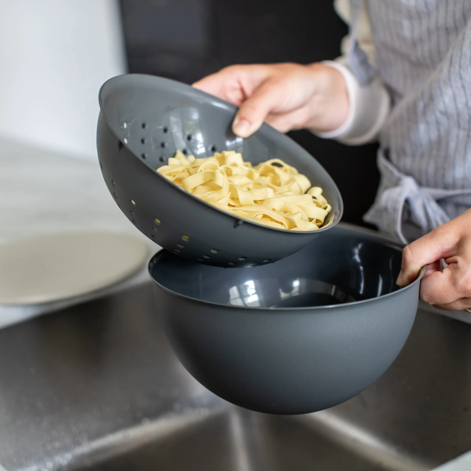 De Koziol Vergiet Palsby Kunststof Grijs ø 21 cm is perfect om noedels, pasta, groente of fruit af te gieten of af te spoelen. Het vergiet van Koziol past perfect in de beslagkom van 2 Liter van Palsby om ruimte te besparen. De perforaties zijn stervormig wat het gietproces sneller laat verlopen en het reinigen makkelijker wordt. Hij kan schoongemaakt worden in de vaatwasser.