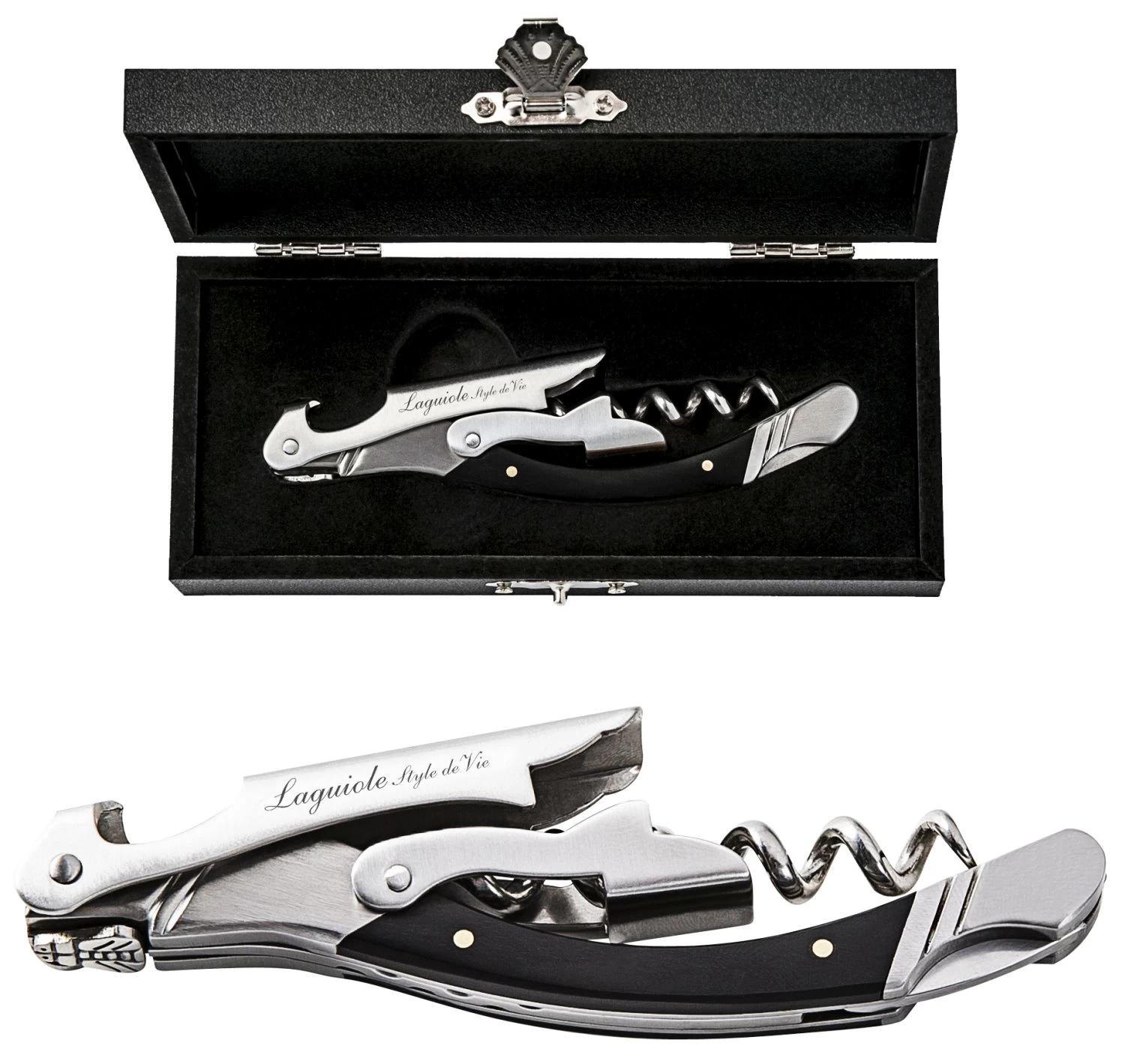 De Laguiole Style de Vie Kurkentrekker is een essentieel item voor in je keukenlade. Deze kurkentrekker heeft twee hefbomen en een kartelmesje. Gemaakt van hoogwaardig RVS en olijfhout, is deze kurkentrekker van uitstekende kwaliteit. Hij wordt geleverd in een mooi, luxueus zwart houten kistje.