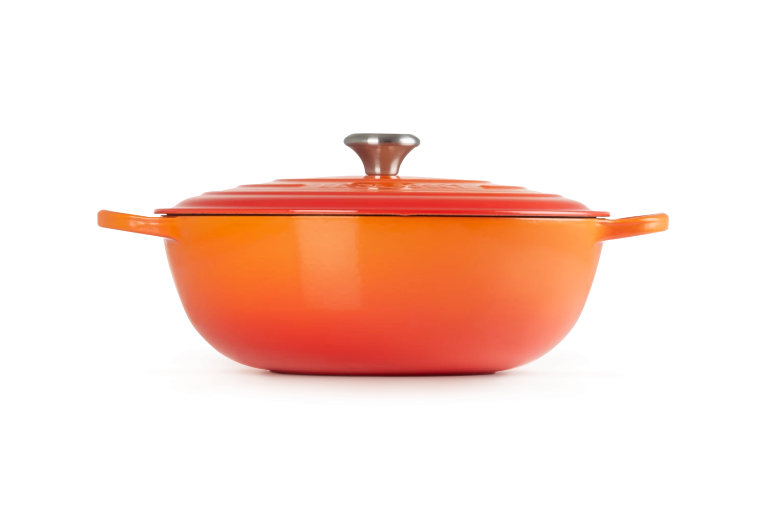 Ben jij op zoek naar een praktische en stijlvolle braadpan? Dan is de Le Creuset Marmite in de prachtige kleur oranjerood wat voor jou. De pan heeft een lengte van 41,9 centimeter en een inhoud van 7 liter, dit maakt hem geschikt voor 6 à 7 personen. De afgeronde zijwanden zorgen voor gemakkelijk roeren en een moeiteloze bereiding van eenpansgerechten. De braadpan is vervaardigd uit geëmailleerd gietijzer wat de warmte vasthoudt, zodat het eten gelijkmatig kan bakken en bruinen.