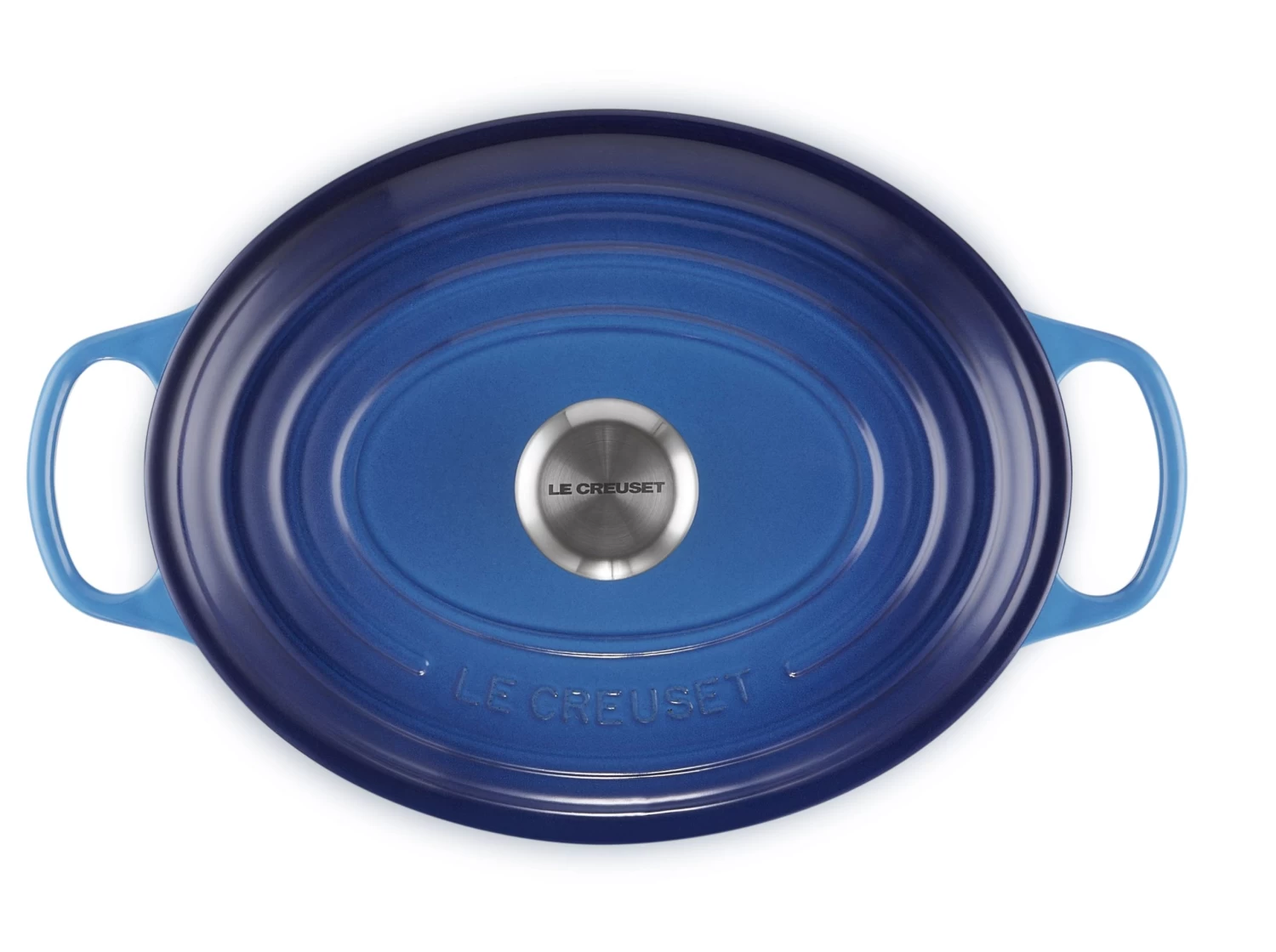 Met deze Le Creuset Braadpan Ovaal Signature Azure – ø 31 cm / 6.3 Liter haal jij een echte eyecatcher in huis. De braadpan heeft een diameter van 31 centimeter en een inhoud van 6.3 liter, dit maakt hem geschikt voor meer dan 6 personen. De pan is vervaardigd uit geëmailleerd gietijzer wat de warmte vasthoudt, zodat het eten gelijkmatig kan bakken en bruinen. Deze braadpan is vrijwel geschikt voor alles, maar staat vooral bekend om verschillende soorten steak en vis in te braden. Deze pannen kunnen namelijk heter worden dan pannen met een antiaanbaklaag.