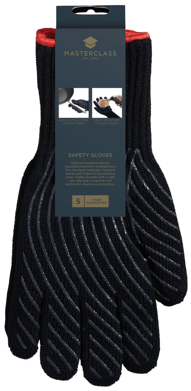 Er zijn geen pannelappen meer nodig door deze MasterClass ovenhandschoenen. De handschoenen zijn gemaakt van hoogwaardig vuur resistent materiaal. De handschoenen zijn ontzettend hittebestendig en kunnen gebruikt worden met temperaturen tot 250 graden. Ook zitten er anti-slip siliconen op de handschoenen, waardoor een pan niet uit de handen glipt. De polsen zijn ook beschermd en daardoor kan er veilig worden gekookt.