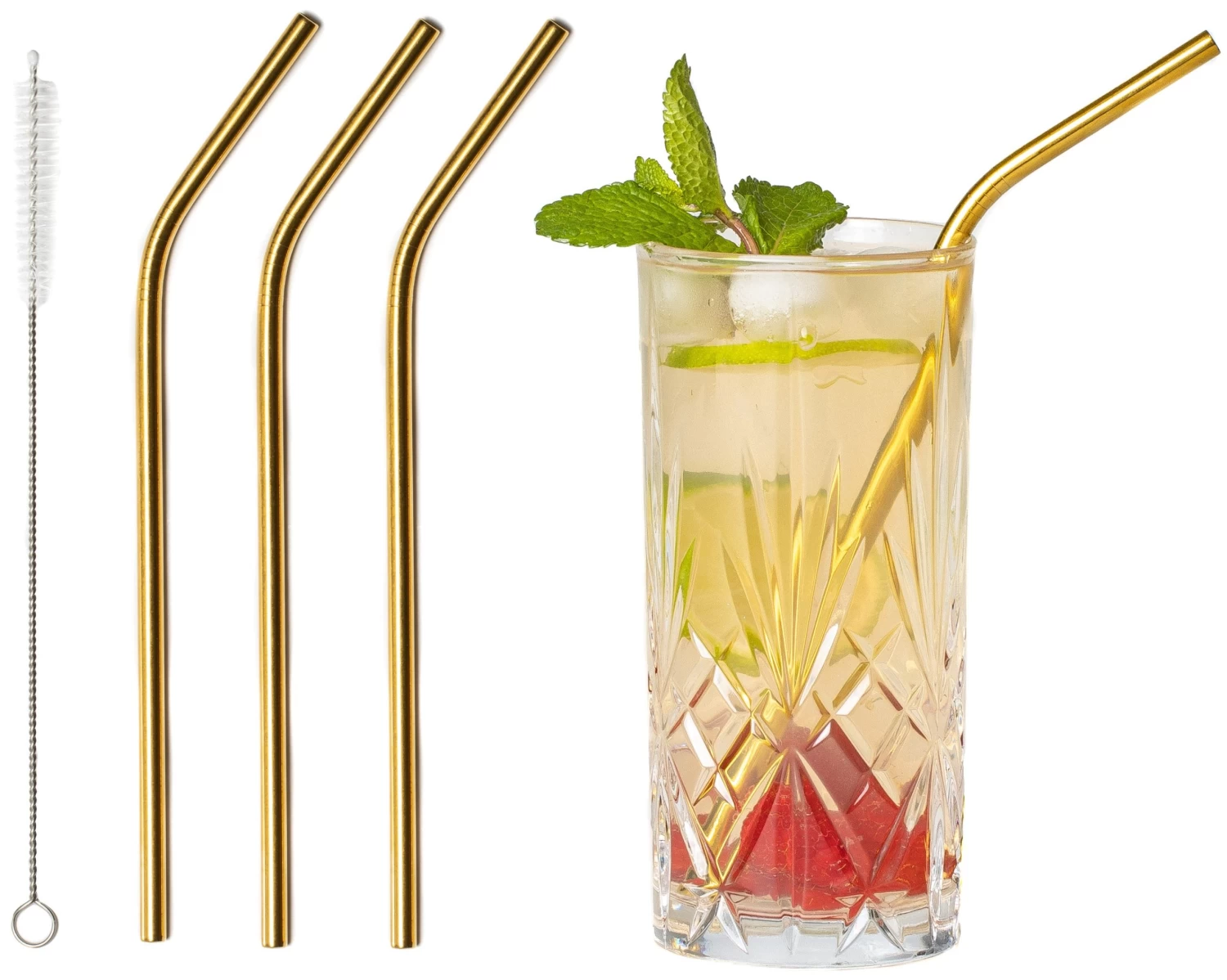 Zijn kartonnen en plastic rietjes die slap worden ook zo’n ergernis voor jou? Dat snappen wij helemaal. Met deze herbruikbare Cookinglife rietjes is een kartonnen smaak verleden tijd! Geniet optimaal van jouw drankje met deze gouden rietjes gemaakt van RVS. Deze rietjes van 21.5 cm zijn gebogen en daardoor ook geschikt voor het lagere glaswerk. De set bestaat uit 4 stuks.