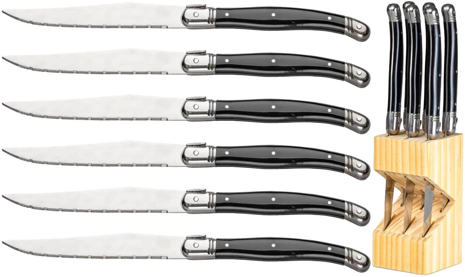Wil jij fijne steakmessen hebben waar je perfect jouw steak mee kan snijden? Met deze Cookinglife steakmessen Laguiole heb je een stijlvolle set van 6 steakmessen. Het roestvast stalen lemmet is 11.5 cm lang en 1.2 mm dik. Door het gekartelde snijvlak snij je eenvoudig door jouw perfect gegaarde vlees. De messen zijn licht van gewicht door de kunststoffen zwarte handvatten. Na gebruik reinig je de steakmessen eenvoudig met een lauw sopje onder de kraan. Deze steakmessen zijn niet vaatwasserbestendig.