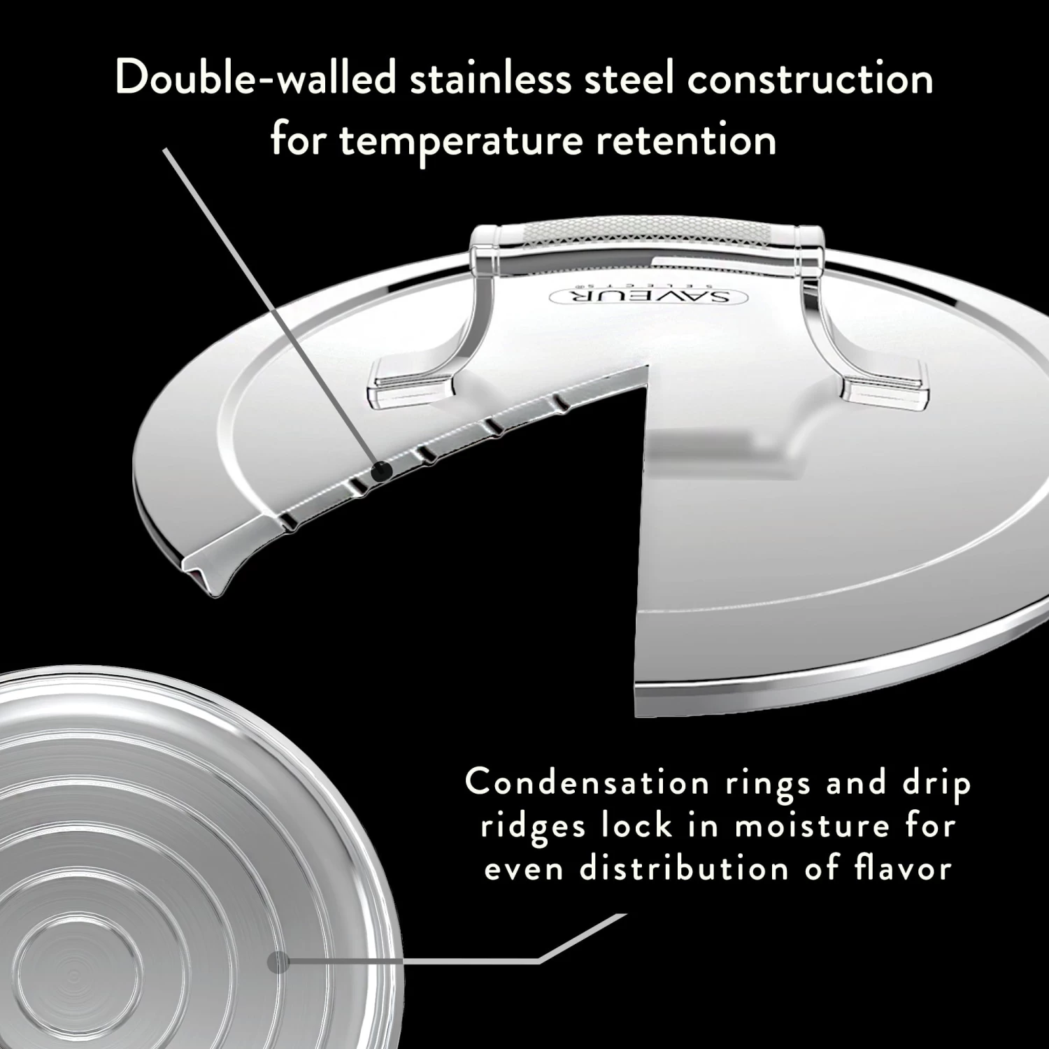 INNOVATIEF, DUBBELWANDIG DEKSEL – Roestvrijstalen deksel zorgt voor een gelijkmatig temperatuurbehoud; de condens ringen en druipranden houden vocht vast en verdelen de smaak gelijkmatig