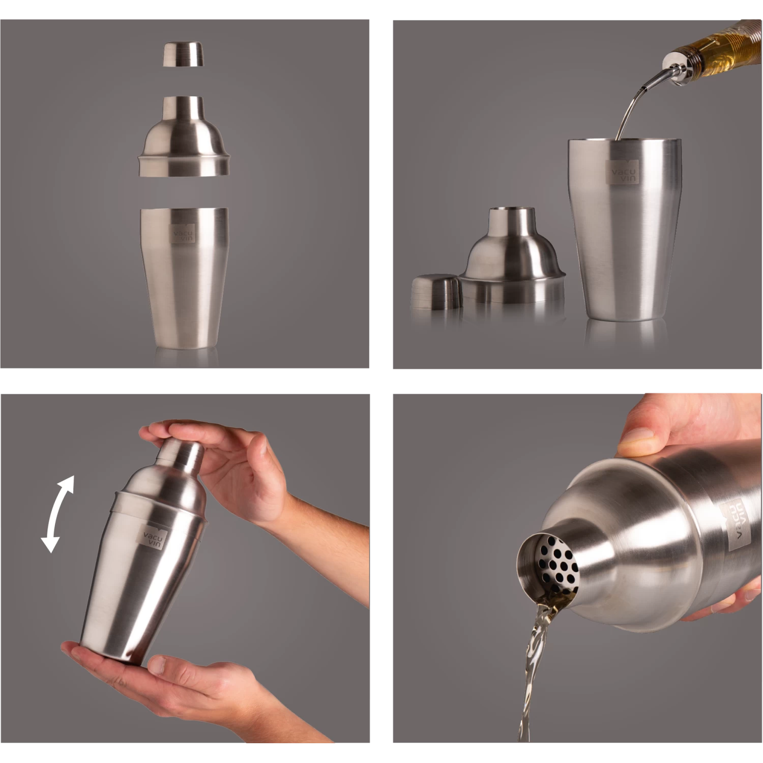De Vacu Vin Cocktailshaker RVS maakt het gemakkelijk om cocktails te maken. De cocktailshaker bestaat uit een boven- en onderkant en dop, die op elkaar te zetten zijn. Om de cocktail te schenken hoeft alleen de dop eraf. In de cocktailshaker zit een ingebouwde zeef. Er past maximaal 550 ml in de cocktailshaker.