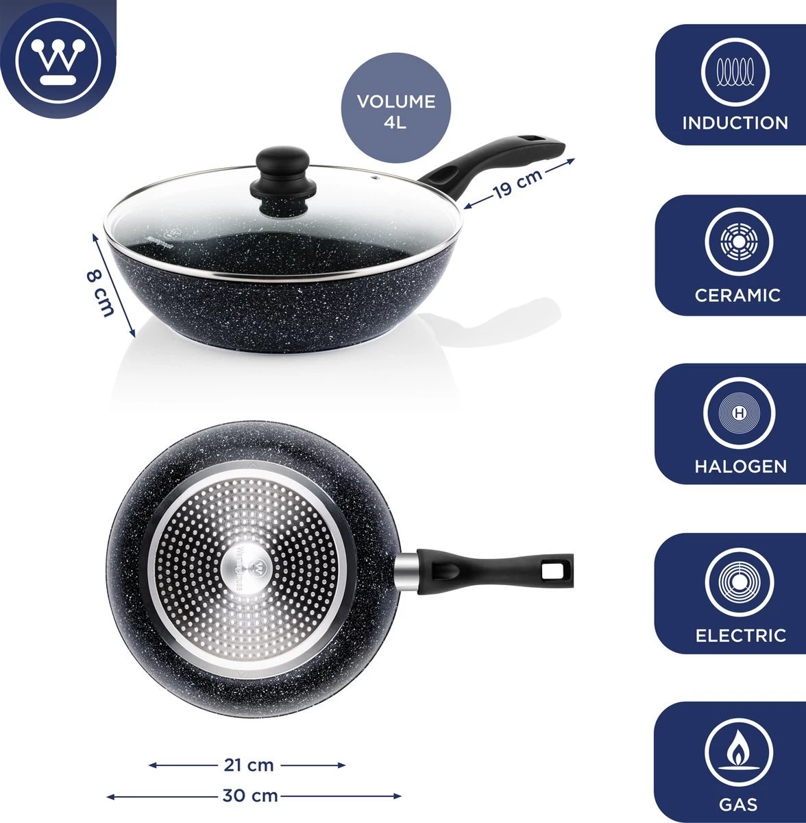 Deze pannenset bevat 1 Westinghouse Zwart Marmer Grillpan 28cm en 1 Wokpan 30cm. Met deze pannenset maak jij de lekkerste roerbakgerechten en de smaakvolste stukken vlees klaar.