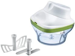 De Westmark groentehakker is perfect voor het hakken van uien, fruit of verse kruiden. Je krijgt er ook een extra garde bij voor het mengen van dressings bijvoorbeeld. Het opvangbakje heeft een inhoud van 25 cl. De groentehakker is gemaakt van kunststof en siliconen, dus na gebruik raden we aan om hem schoon te maken met wat warm water en mild afwasmiddel.